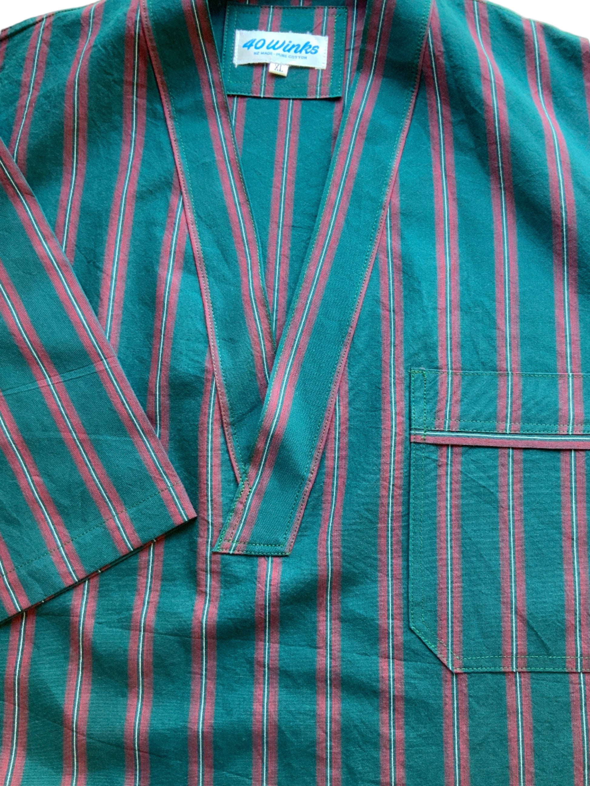 Stay cool and comfortable with our 100% pure cotton nightshirt. A lightweight fabric (90gsm = a light fabric weight rating). The dark green stripes are 2cm wide, inbetween deep red and white.